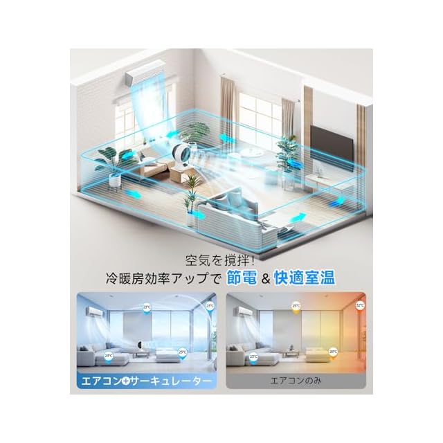 ✨【家計を救う革命的な節電パフォーマンス】サーキュレーター DCモーター搭載で最大消費電力28W、1時間たった1.02円の驚異的省エネ!電力単価36.6円/kWh計算で、エアコン28℃設定と併用すれば26℃単独運転より1時間あたり6.67円節約。1日8時間×30日で約1,600円削減エアコンと併用すれば、風を対流させて室内にまんべんなく空気を循環させることで冷暖房効率200%UP!「サーキュレーター 静音」運転中も電気代を圧縮!※実際の節約効果は環境により変動