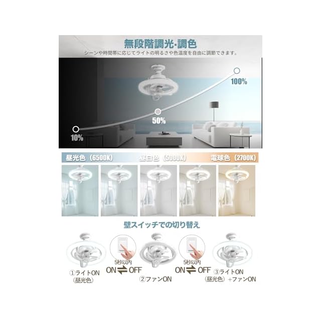 【長寿命で省エネなLED搭載・無階段調光調色・リモコン付き】ファン付きシーリングライトは高品質なLEDライトを搭載して、リモコンで「輝度」「CCT」ボタンを長押してお部屋の雰囲気やシーンに合わせて純正色温度3000K〜6500Kの昼光色・昼白色・電球色の3色温度10%〜100%までの無階段切替が可能です。安定したLED全光束4000LMの明るさを提供し、耐用年数 50,000時間に達し、5年間交換不要で、省エネで長寿命を実現!色と明るさの変化に応じて部屋に良い雰囲気を作り出すことができます。寝室、リビングルーム、台所、廊下、書斎、玄関、トイレ、オフィスなど様々なシーンで活躍です。