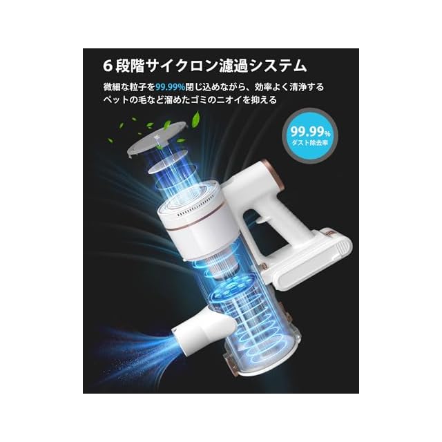【サイクロン式&6重濾過システム&ワンタッチゴミ捨て、お手入れ簡単!】この掃除機は、サイクロン式粉塵分離とHEPAフィルターによる6段階密閉ろ過システムが付き、99.99%の粉塵を捕らえ、非アレルギー性の浄化された空気を排出します。花粉症の方に優しく、二次汚染のない濾過を実現しました!また、1.0Lの大容量ダストカップは、ワンタッチでスムーズに開閉する構造で、ゴミやホコリに触れずに衛生的にゴミ捨てが可能です。コードレスクリーナーの性能を常に最適な状態に保つために、付属フィルターやヘッドブラシが簡単に取り外せて、お手入れが可能です。毎日のお掃除は楽々、いつでもどこでも家の中を清潔に保てます。