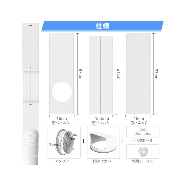 商品名:窓用ダクトパネル 3枚セット テラス窓用 窓枠高さ67から182cmまで使用可 雨よけ付き 二重径対応 密封性向上 スポットクーラー 排気 移動式クーラー ポータブルエアコン対応
