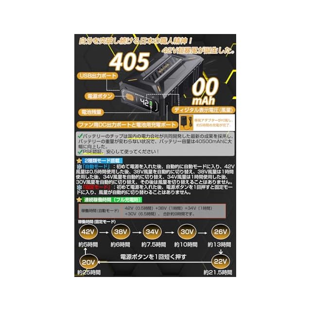 商品名:【42V超高出力 2025NEW 最強風】作業服 ファンバッテリーセット 40500mAh大容量バッテリー Super Cool 最大25時間連続稼働 7段階風量調節 2種類モード搭載 男女兼用 PSEマーク認証済 日本語説明書付き[日本ブランド正規品]