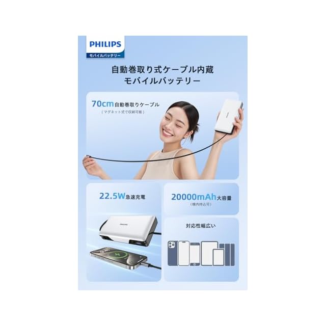 商品名:Philips (フィリップス) 巻き取り式 モバイルバッテリー 20000mAh 大容量 入出力 タイプc 約70CMケーブル内蔵 22.5W急速充電 3台同時充電 USB-Cポート パススルー機能搭載 iOS/Android対応 機内持込可 旅行/出張/停電対策/防災グッズ DLP2721CW