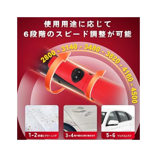 【六段階可変速度制御】 六段の回転数2800~4500rpmを簡単に調整可能:低速(2800-3200rpm)は繊細な塗装面の修復に適し、中速(3300-3800rpm)は通常のポリッシングに対応し、高速(3900-4500rpm)はプロフェッショナルレベルの鏡面処理を実現します。独自のモーター制御技術を搭載し、各段階でのトルクを安定的に出力します。