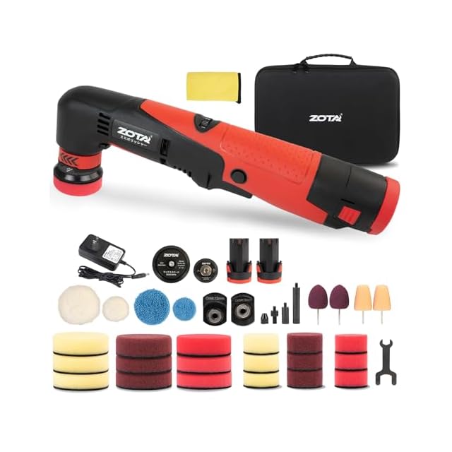 【豊富な付属品】ZOTA電動ポリッシャー 付属品が豊富で充実しており、充電器+12Vバッテリー2個+各種ポリッシングパッド+交換用パーツが同梱。フルセット装備と日本語取扱説明書付きで、開封後すぐに使用可能。専用収納ケース付きで携帯に便利。