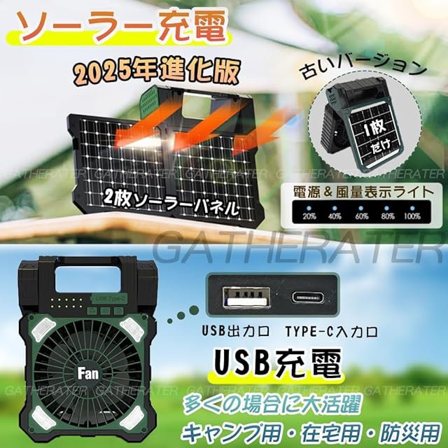 【ソーラー充電とUSB充電】GATHERATERで生産した2025年最新のソーラー扇風機は大きな強化した2枚のソーラーパネルを搭載し、5.4Wのソーラーパネルを利用して太陽光で充電できるからアウトドアの電源がない場所でも涼しい風を続けて楽しめるソーラーファンです。キャンプ 扇風機は5200mAhのバッテリーを内蔵しています。ソーラーパネルを利用して太陽光で充電できるからアウトドアの電源がない場所でも涼しい風を続けて楽しめるソーラーファンです。自宅ではUSB充電が可能です。(充電は5V2A出力のアダプターを使用してください)。