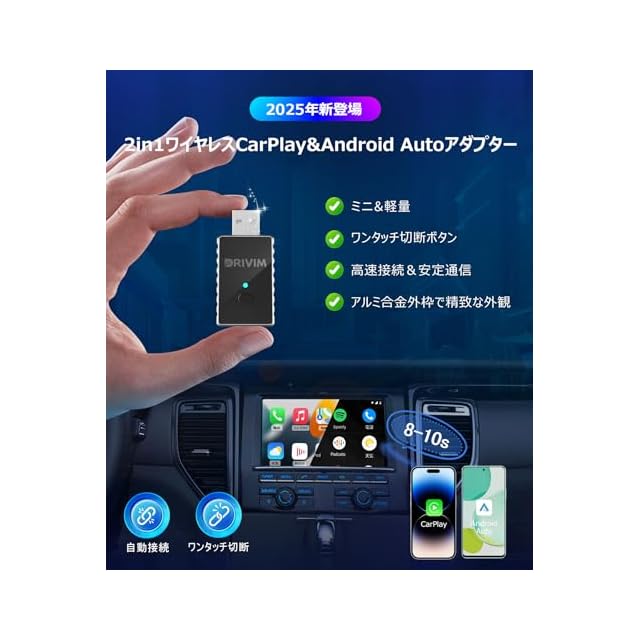 <b>置くだけで愛車がワイヤレス化。DRIVIM MiniワイヤレスCarPlay&Android Autoアダプターは、USBメモリのような洗練された超小型デザインと高級感のあるアルミ合金ボディで、車内をスタイリッシュに演出します。</b><br> <br> 従来の煩わしい配線とサヨナラし、USBポートに挿すだけでCarPlay/Android Autoをワイヤレス化。毎回の接続設定は不要で、一度ペアリングすれば自動再接続。2台までのスマートフォン履歴を記憶でき、ワンタッチで簡単に切り替えられるため、ご家族やパートナーとの共有にも最適です。<br> <br> <b>先進のWiFi 6(1024-QAM・2.4GHz/5GHzデュアルバンド・最大9.6Gbps)とBluetooth 5.4を搭載</b>し、従来規格より格段に高速&安定した通信を実現。データ遅延や電波干渉を気にせず、どこでも快適な操作が可能。ナビ、音楽、通話、音声アシスタントなどの機能を有線時と変わらずスムーズにワイヤレスでご利用いただけます。車両の純正ボタンやタッチパネル、ノブなどの操作感もそのまま。<br> <br> <b>iPhone(iOS 10以降)、Androidスマートフォン(Android 11以降)に両対応し、2016年以降の有線CarPlay/Android Auto搭載車に幅広く対応。</b>USB-AおよびType-C変換アダプターが付属しているため、様々な車種・接続方式にしっかりフィットします。<b>ご注意:</b> BMW、テスラ、一部のワイヤレス純正CarPlay/Android Auto搭載車、および一部社外ナビには対応しておりませんので、事前に車種のご確認をおすすめいたします。<br> <br> <b>技適認証(認証番号: 220-JP7656)取得済みで安心してご利用可能。</b>1年間のメーカーと日本語取扱説明書も標準付属、アフターサポートも充実しています。また、OTAオンラインアップデートに対応しているため、ご購入後も常に最新の機能やセキュリティが自動で適用。これ一台で、よりスマートで快適なカーライフをサポートします。<br>