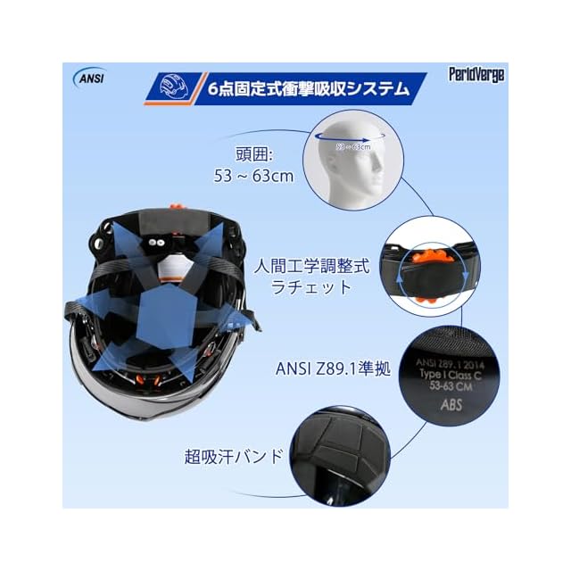 OSHA認証:高耐衝撃かつ貫通抵抗性に優れたABS素材で製造された当社の安全ヘルメットは、軽量で快適な装着感と優れた耐久性を両立しています。Perldverge 建設用ヘルメットはOSHA認証を取得しており、ANSI Z89.1 Type 1 Class C規格に適合しています。ANSI規格番号と製造年月日はヘルメットのつば内側に永久刻印されています