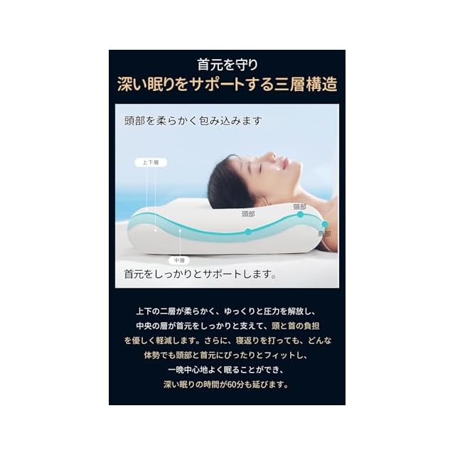 【3層構造で姿勢に合わせたサポート】 上下層:柔らかい低反発メモリーフォームが頭部を優しく包み込み、圧力を分散。 中部:高密度素材で首元をしっかり支え、自然なアライメントを実現。 仰向け・横向き・うつ伏せなど、どんな寝姿勢でも頭と首の負担を軽減し、深い眠りを誘います。
