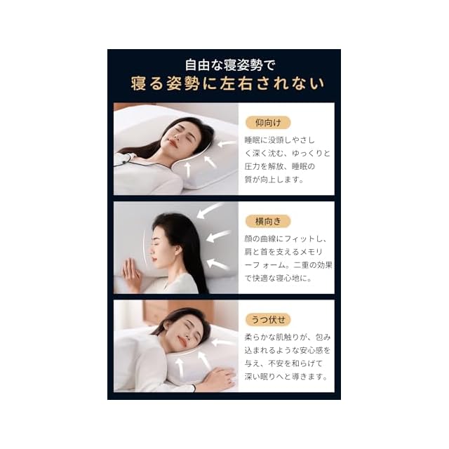 【3層メモリーフォーム】高密度メモリーフォームの中央層が首の自然なカーブをしっかり支え、上下層は柔らかく頭部を包み込み、仰向け・横向き・うつ伏せ全ての寝姿勢に対応。