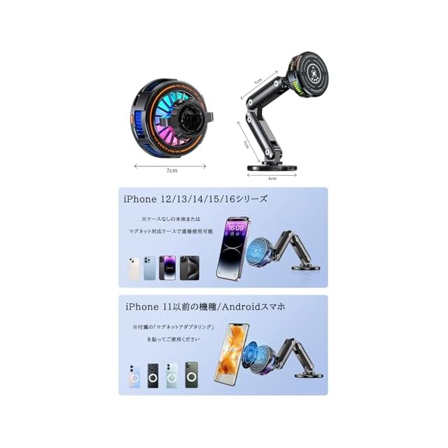 革新的な「電動冷却付き」スマホホルダーが登場!<br> 本製品は、スマートフォンを瞬時に冷却できる半導体ファンと、真空磁気吸引による強力固定を融合した、次世代型の車載ホルダーです。<br><br> 【冷却ファンで温度上昇を防止】<br> ナビ使用中や長時間のスマホ操作でも、スマートフォン本体の温度を3段階で自動調整し、バッテリー劣化や動作不良を防ぎます。<br><br> 【磁気+真空のダブル固定】<br> マグネット式でスマホを瞬時に吸着、さらに電動真空固定で落下の心配なし。片手で簡単に着脱可能です。<br><br> 【360°回転・自由な視野角】<br> 好きな角度に調整できるスイベル設計で、運転中のナビ確認がさらに快適に。助手席との画面共有も可能です。<br><br> 【RGBライト搭載で車内演出】<br> カスタム可能なRGBイルミネーションが、夜のドライブをスタイリッシュに彩ります。<br><br> 【幅広いデバイスに対応】<br> iPhoneシリーズ(11〜16)やAndroid端末に幅広く対応。MagSafe互換、または金属プレートでどんなスマホにも使えます。<br><br> 出張、旅行、日常の通勤など、あらゆるドライビングシーンで活躍するスマートホルダー。快適で安全なカーライフをサポートします。