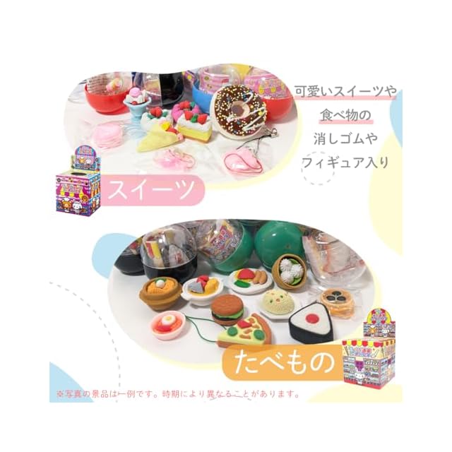 ●動物:一つのカプセルに動物マスコット2つ入り●恐竜:一つのカプセルに恐竜マスコットや消しゴム2つ入り●手品:手品グッズ1つ入り●スイーツ:スイーツのマスコットや消しゴム1つ入り●食べ物:食べ物のマスコットや消しゴム1つ入り●ミニカー:プルバックカー1つ入り●生産国:中国