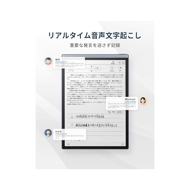 <p>記録・要約・翻訳・読書がこれ一台で完結!</p> <p>後回し業務をゼロに!心強い、賢い相棒:iFLYTEK AINOTE Air 2</p> <p>83言語文字をテキスト化</p> <p>授業の板書も学習ノートも会議メモも、瞬時にデジタル化!手書きの自由さとデジタルの便利さを両立させ、メモ整理が劇的に変わります。</p> <p>15言語音声文字起こし&10言語双方向翻訳</p> <p>リアルタイム音声文字起こしで会議やインタビューで、もうメモは不要です。話者を自動識別し、15言語対応のリアルタイム音声文字起こしで重要な発言を逃さず記録できます。さらに10言語に対応した双方向翻訳を無料でサポート。国際会議や語学学習も、母国語で管理可能です。</p> <p>ChatGPTで議事録を即作成</p> <p>ChatGPTとの連携で会議後の議事録を瞬時に作成できます。後回しの作業をゼロにし、仕事の生産性が大幅にアップします!</p> <p>● 文字起こしに対応している15言語</p> <p>英語、日本語、韓国語、フランス語、ドイツ語、スペイン語、広東語、ロシア語、マレー語、ベトナム語、アラビア語、タイ語、インドネシア語、中国語、ハンガリー語</p> <p>● 翻訳に対応している10言語</p> <p>英語、日本語、韓国語、フランス語、ドイツ語、スペイン語、中国語、ハンガリー語、アラビア語、ロシア語</p> <p>● 手書き文字のテキスト変換に対応している83言語</p> <p>英語、フランス語、ドイツ語、スペイン語、イタリア語、ハンガリー語、ポルトガル語、タイ語、ロシア語、アラビア語、中国語、日本語、韓国語、その他70言語</p> <p>まるで本物の紙のような書き心地</p> <p>超低遅延で、まるで紙に書いているかのような書き心地を、8.2インチの大画面でお楽しみいただけます。画面占有率88.5%という驚異的な比率により、没入感のある視界を提供し、創造性と生産性の向上に最適です。</p> <p>書き込み&音声同期</p> <p>AINOTE Air 2を使用すると、手書きのメモを取りながら音声をスムーズにテキストへ変換できます。従来のノートテイキングとiFLYTEKの最先端AI技術の完璧な融合を体験してください。</p> <p>スマートスケジュール</p> <p>iFLYTEK AINOTE Air 2では、手書きメモの横に星マークを描くだけで重要事項として自動生成可能です。さらに、丸を描くことでスケジュールのToDoリストに自動生成されます。</p> <p>ファイル管理がスムーズに</p> <p>OneDriveクラウドストレージにログインすれば、ドキュメントの閲覧、ダウンロードに対応。どこでも、いつでもアクセス可能になります。</p> <p>AINOTE Air 2は、単なる端末ではなく、ユーザーが「書き込む」「記録する」体験を根本的に刷新する新しい次元の書き込みツールです。そのデザインと技術は、日々の作業や創造的な活動をより効率的に、そして快適にサポートします。</p>