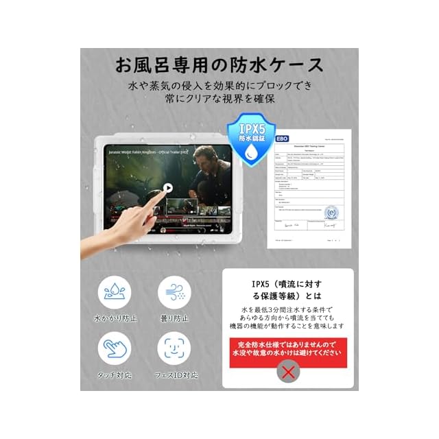 「耐水防曇設計で水まわり環境を完全サポート」シャワー中や手が濡れた状態での操作にも問題ありません。ケース内部のシリコンパッキンとスポンジパッドが水や蒸気の侵入を効果的にブロックできます。防曇加工を施した画面で、急激な温度変化によるくもりを軽減し、常にクリアな視界を確保します。※完全防水仕様ではないため、長時間の水没や故意の水かけは避けてください。