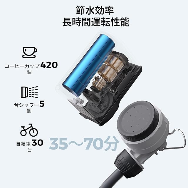 【デュアルモードシャワー】:2500mAhバッテリーを搭載。片手で低流量と高流量を切り替えられます。低流量では毎分0.37ガロン(約1.8リットル)の節水速度で最大70分間、高流量では毎分0.66ガロン(約1.8リットル)の節水速度で最大35分間使用できます。各モードは節水と到達距離を考慮しており、あらゆる屋外シャワーのニーズに応えます。