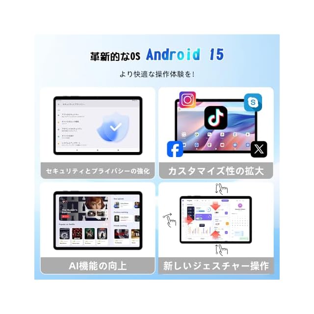 ✅「最新の Android 15 システムと AI インテリジェント処理」TABWEE T80 10インチ タブレットは最新Android15 OSを搭載し、より快適で安全な機能であなたの生活をアップグレードします。よりスマートに、より速く、より直感的に操作できます。android15 システムと Gemini AI を組み合わせることで、タブレット体験がさらに向上します。リアルタイム翻訳、スマートなテキスト提案、使用習慣を学習してパフォーマンスを最適化する AI 強化マルチタスクをお楽しみください。優れたエネルギー効率比を提供し、学習、オフィス、オーディオビジュアルエンターテイメントなどのさまざまなシナリオに簡単に対応できます。