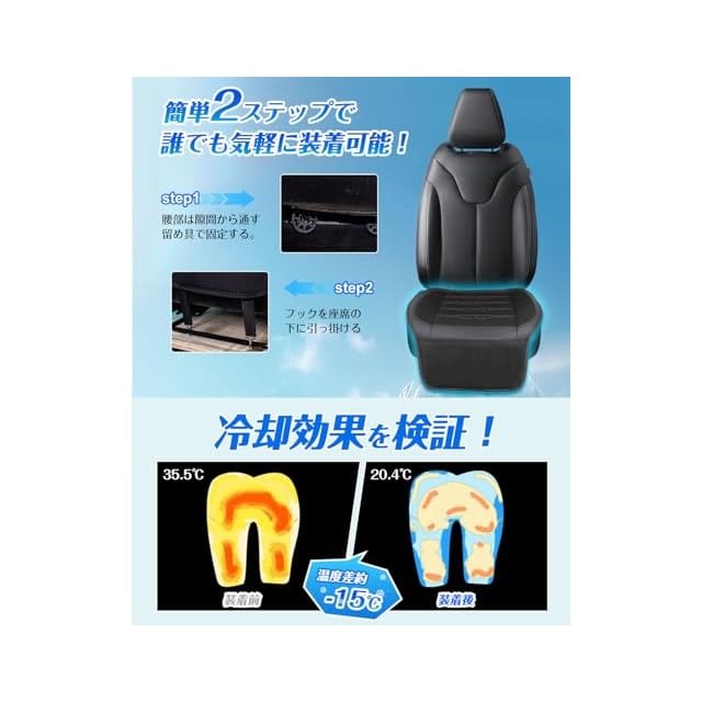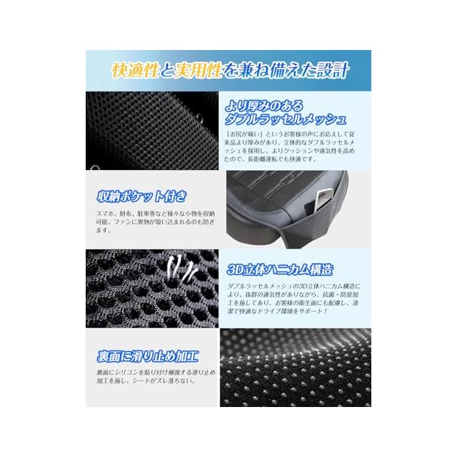 【快適性と実用性を兼ね備えた設計】✅より厚みのある「ブルラッセルメッシュ」生地。「お尻が痛い」というお客様の声にお応えして従来品より厚みがあり、立体的なダブルラッセルメッシュを採用し、よりクッションや通気性を高めたので、長距離運転でも快適です。✅3D立体ハニカム構造。ブルラッセルメッシュの3D立体ハニカム構造により、抜群の通気性がありながら、抗菌・防臭加工を施してあり、お客様の衛生面にも配慮し、清潔で快適なドライブ環境をサポート!✅滑り止め加工。クールシート裏面にシリコンを貼り付け補強する滑り止め加工を施し、シートがズレ落ちない。✅収納ポケット付き。スマホ、財布、駐車券など様々な小物を収納可能、ファンに異物が吸い込まれるのも防ぎます。