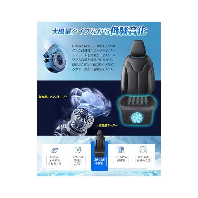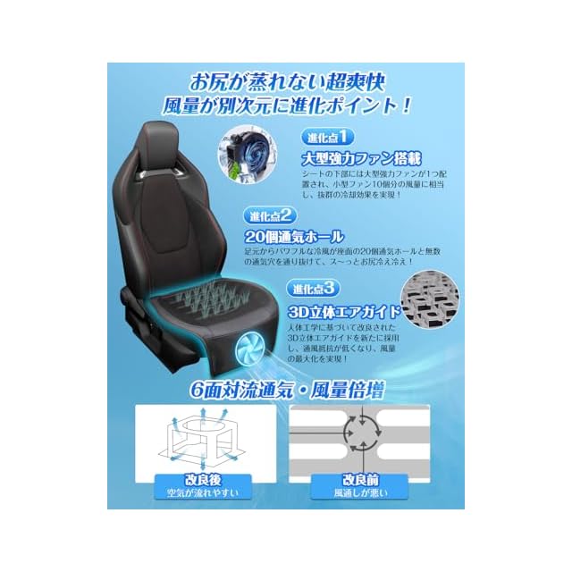 【革新版大型ファン搭載・3D立体エアガイド・20個通気ホール】従来品とは違い、独創した大型ファンは減音型モーターとファンブレードを搭載しており、パワフルな風を産み出しながら、動作音が約35dbに抑えられているので、運転の邪魔をしない。人体工学に基づいて改良された3D立体エアガイドを新たに採用し、通風抵抗が低くなり、風量の最大化を実現!座面の20個通気ホールと合わせて、エアコンの冷風が素早く吸われて環循させてお尻まわりに噴射!従来の「風量が弱い」という難点を解決しました。