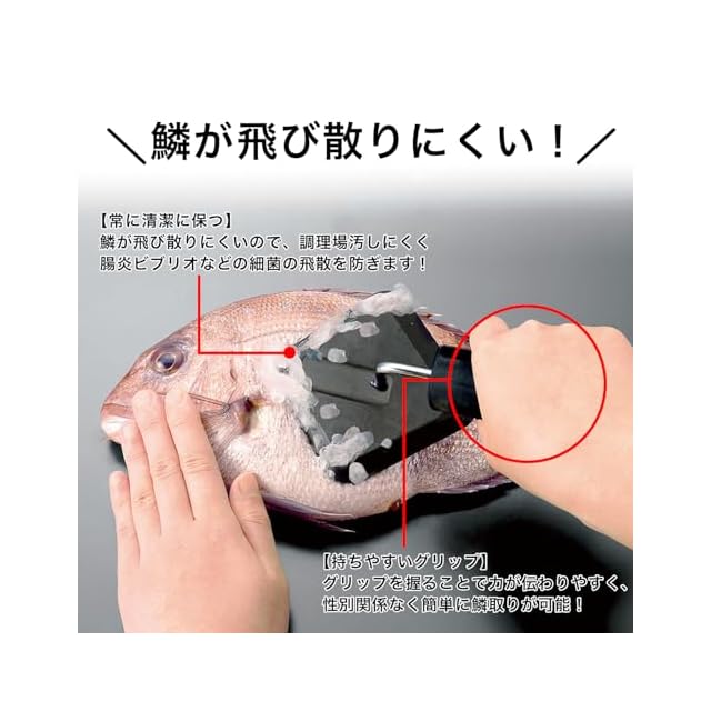 【飛び散らず衛生的】鱗が飛び散りくいので調理場環境を汚しにくく、清潔に保ちやすいため腸炎ビブリオなどの細菌飛散を防ぎやすいのが特徴です。