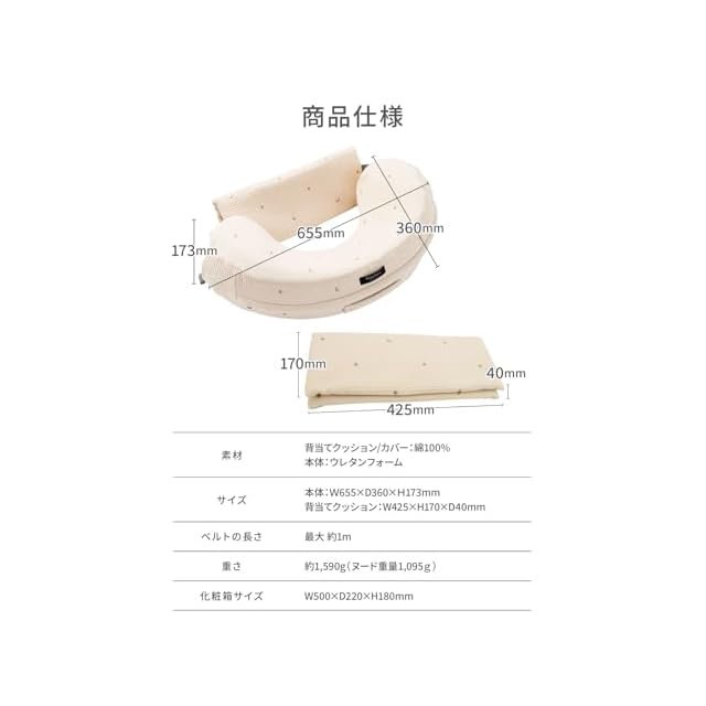 ■授乳しやすいカーブ設計 ■しっかり支える固さと高さ ■ズレを防ぐサポートベルト付き ■背当てクッションで腰や背中の負担を軽減 ■綿100%イブル生地 ■いつでも清潔!洗えるカバー