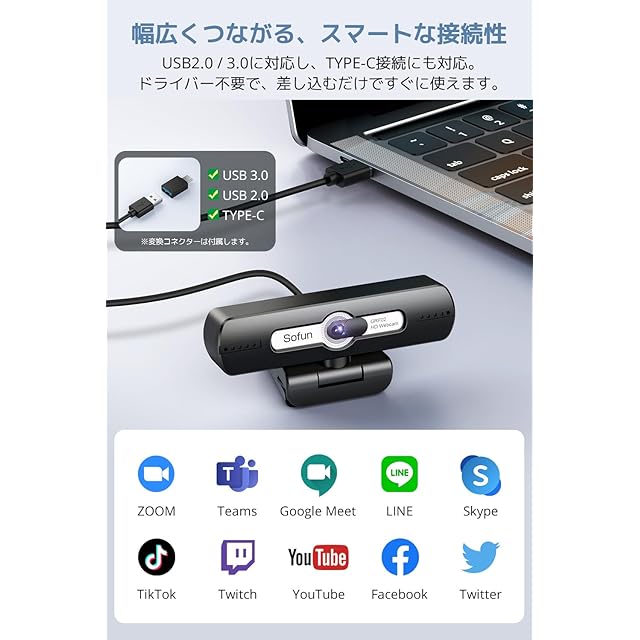 【幅広いデバイスに対応・ドライバ不要】USB2.0/3.0およびType-C接続に対応し、Windows(11/10/8/7)、Mac OS、Linux、Chromebookなど幅広いOSで使用可能な 小型 webカメラ 。ドライバ不要・プラグ&プレイ設計により、差し込むだけですぐに使える手軽さも魅力。 Zoom配信カメラ や 配信用 Webカメラ として、YouTube、Facebook、Teams、Twitchなど多様なプラットフォームでの利用もスムーズな 人気 ウェブカメラです。
