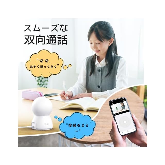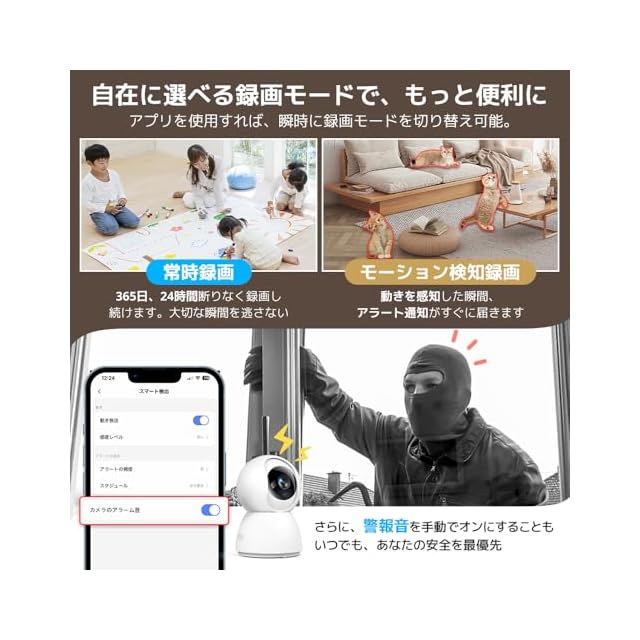 ✅【双方向通話&自動録画モードでさらなる安心を】カメラ越しに、まるでその場にいるかのような会話を。 監視カメラ 双方向通話機能により、外出先からお子さまやペットに声をかけたり、室内の様子を確認することが可能な ペットみまもりカメラ iphone対応 です。録画モードは常時録画・モーション検知録画を自由に切り替え可能。365日24時間録画に対応し、動きを感知すれば自動で記録・アラート通知。必要に応じて警報音を鳴らすこともでき、万全のセキュリティ体制を実現します。