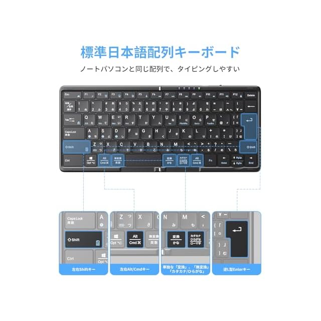 ✅【革新進化版・標準JIS配列2つ折り畳み式キーボード】折りたたみキーボード はJIS規格標準日本語配列で、大型のEnterキー、左右shiftキー、左右Altキーを配置されて、普段よく使いのキーボードと同じ配列で、使い慣れてからタイピングしやすいです。