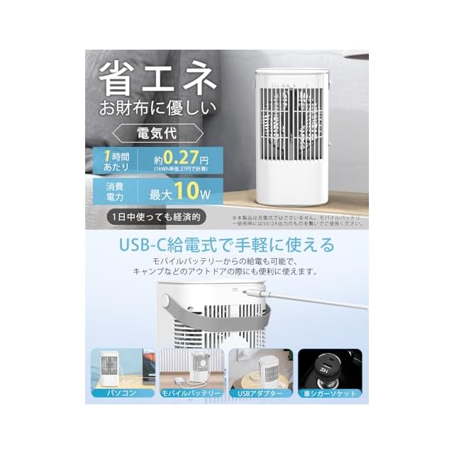 ❉彡【使いやすいUSB給電式・10W省エネ・節電対策】Aliliyの卓上冷風機はUSB給電式なので、使用時にUSB接続が必要、パソコンやモバイルバッテリーなどからの給電に対応して、コンセントが近くにない場所でも使用できますので、車中泊やキャンプなどのアウトドアの際にも便利に使えます。水の力で冷やす冷風機、最大出力はわずか10Wで、1時間当たりの電気料金はたったの約0.27円、1日8時間使っても、1カ月の電気代はわずか約64.8円とかなりの省エネ仕様、夏の電気代はクーラーに比べ圧倒的に抑えることができ、家計に大きく役立ちます。