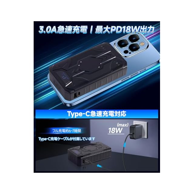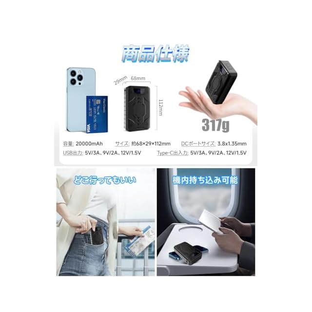 商品名:mAh 空調作業服 バッテリー 20000mAh 大容量 6V-12V高出力 18W最大出力 6段階風力調節 DC/USB/Type-C出力ポート 空調作業服専用モバイルバッテリー LED残量・風量段階表示 空調ベストバッテリー 空調ウェア 専用バッテリー Type-C急速充電 スマホ充電器 携帯充電器 小型 軽量 持ち運び便利 作業着専用 機内持ち込み可能 旅行/出張/緊急用
