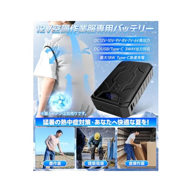 ✅【USB/DC/Type-C出力ポート・幅広い互換性】mAh空調作業服専用モバイルバッテリーはDCとUSBとType-C出力ポートを同時に搭載されています。市販されている99%以上12V空調作業服ファンは互換性があり、軽量でコンパクトサイズは空調作業服のポケットに入れても行動の邪魔に全然なりません。通常のモバイルバッテリーに比べて、空調作業服や電熱ベストの専用バッテリーとして使用できるだけでなく、スマートフォンやタブレットなどのほとんどのデバイスにも適しています。スマートフォンに複数回の充電が可能です。通信設備の電源切れの心配がなく、緊急災害対策用としても最適です。
