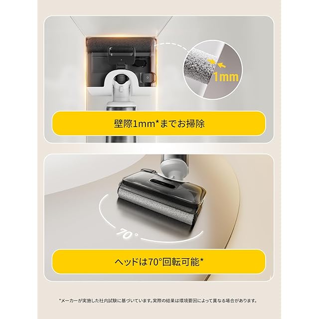 【どんな汚れもサクッと除去】ロボロックF25 RTは吸引&水拭き両用のコードレス掃除機で、20000Pa*のピーク吸引力で濡れた汚れも乾いた汚れも一掃し、同時に床をキレイな水で清掃します。さらに、70°*回転可能のヘッドが机や椅子の下も手軽に掃除でき、細かい汚れもしっかりと取り除きます。*使用前必ず清水タンクに水を入れてください。