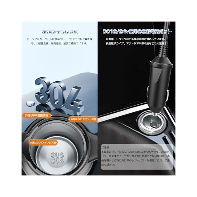 【12V&24V兼用 車載電気ポット】カップは304ステンレス鋼と食品グレードの素材を採用しています。空焼きをインテリジェントに停止できます。耐久性があり、安全に使用できます。スマートな温度制御が可能です。