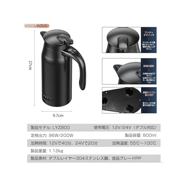12V/24V兼用 車用電気ポット 車用湯沸かし器 800ml大容量/食品級ステンレス鋼/小型車トラック兼用/仕事/旅行使用便利/お茶入れ/卵煮ること/コーヒー入れ/カップラーメン入れ/牛乳が温まる