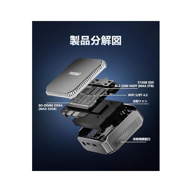 商品名:FIREBAT ミニpc 最新第13世代インテル Twin Lake N150 4コア4スレッド 3.6 GHz最大周波数 WiFi 5 Bluetooth 4.2 ミニパソコン 超軽量/静音/高性能/業務用マイクロ/VESA 壁掛け 家庭向け オフィス向け ゲーム向け 携帯pc【16GB DDR4+512GB M.2 2280】N150 Intel mini pcメモリとハードディスク交換できる