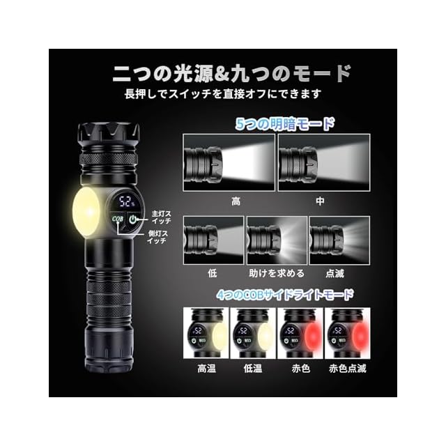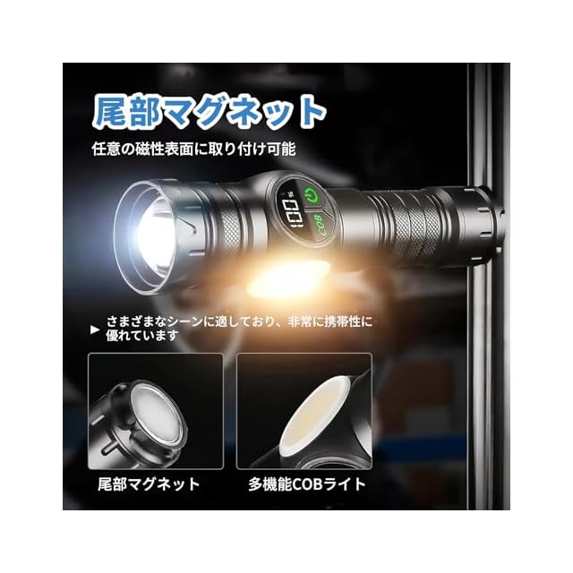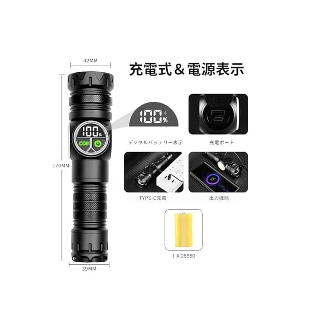 【懐中電灯 製品仕様】サイズ:17cm*4.2cm*3.9cm 重量:約190g(本体)バッテリー重量:約70g 【2025年新型超高輝度小型軽量懐中電灯】新世代26650エコリチウムバッテリーを採用し、全体的に超長寿命でコストパフォーマンスに優れています。1500ルーメンの照射光源で、照射範囲は500メートルを超えます。懐中電灯の側面にはCOBライト機能が追加されており、合計9種類の点滅モードがあります。