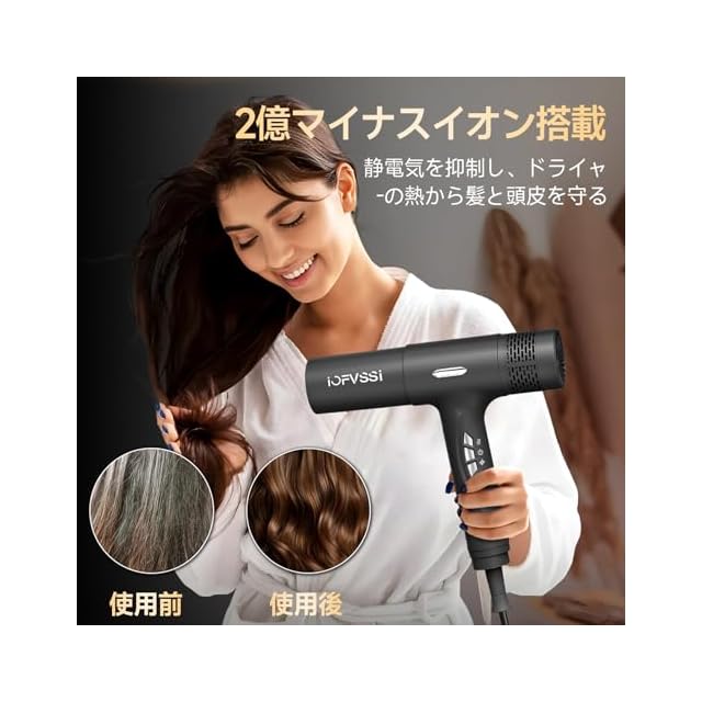 商品名:IOFVSSIドライヤー 大風量 速乾 ヘアドライヤー 高濃度マイナスイオン搭載 冷風/熱風 3段階温度調節 65dB低騒音 過熱保護機能 ノズル付き 家庭用/旅行用 美髪 静電気除去 PSE認証済み (グレー)