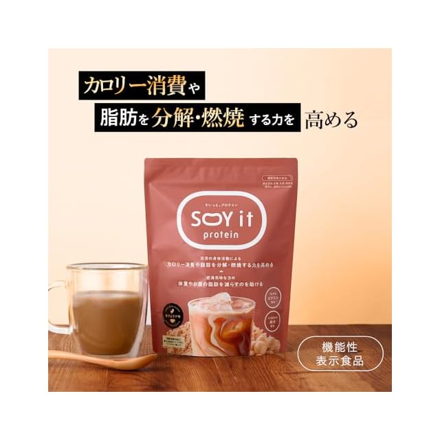 「そいっと。プロテイン」は機能性表示食品の置き換え でない プロテイン です。葛の花由来イソフラボン配合で、肥満気味な方の体重やお腹の脂肪を減らすのを助ける効果があります。また、日常の身体活動によるカロリー消費や脂肪を分解・燃焼する力を高めます。さらに、チャコールやカプサイシン、乳酸菌といった成分も配合。プロテインなのに美味しく、溶けやすいので シェイカー も必要ありません。<br> 【内容量(1袋あたり)】:150g <br>【サイズ】: 縦23cm 横18cm 高さ5cm <br>【使い方】:水100mLに付属スプーン2杯分(10g)溶かし、1日1杯を目安にお召し上がりください。<br>【使用上の注意】:本品は多量摂取により疾患が治療したり、より健康が増進するものではありません。1日摂取目安量を守ってください。過剰摂取はお控えください(体質や体調によっては、からだに合わない場合があります)。 体調に異変を感じた時は、速やかに摂取を中止し、医師に相談してください。妊娠中の方あるいは妊娠の可能性がある方は医師に相談してください。<br>【保存方法】:高温、多湿及び直射日光を避けて保存してください。<br> 【原材料】:粉末状大豆たん白(国内製造)、ポリデキストロース(水溶性食物繊維)、脱脂粉乳(乳成分を含む)、コーヒーパウダー、葛の花抽出物、食塩、殺菌乳酸菌末/ビタミンC、増粘剤(キサンタンガム)、甘味料(ステビア、スクラロース)、乳化剤、ピロリン酸第二鉄、香料、ビタミンB₆、ビタミンB₁、ビタミンB₂、炭末色素、香辛料抽出物、ビタミンB₁₂
