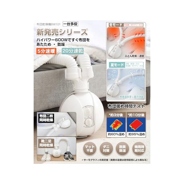 【5分速暖&20分速乾・1台多役&一年中活躍・マット不要】:600Wのハイパワーふとん乾燥機で、布団を温め、素早く乾燥させることができます。布団のほか、衣類乾燥、くつ乾燥、押し入れ乾燥、ダニ退治、ペット乾燥、足元に置いてヒーターとしても使えます。春は花粉対策(室内干し)、夏は梅雨や台風の湿気対策、秋は衣類乾燥とダニ退治、冬は寒さと湿気対策と、1年中オールシーズン簡単に対応できます。ホースを伸ばして布団をかけるだけで運転でき、マットは不要です。