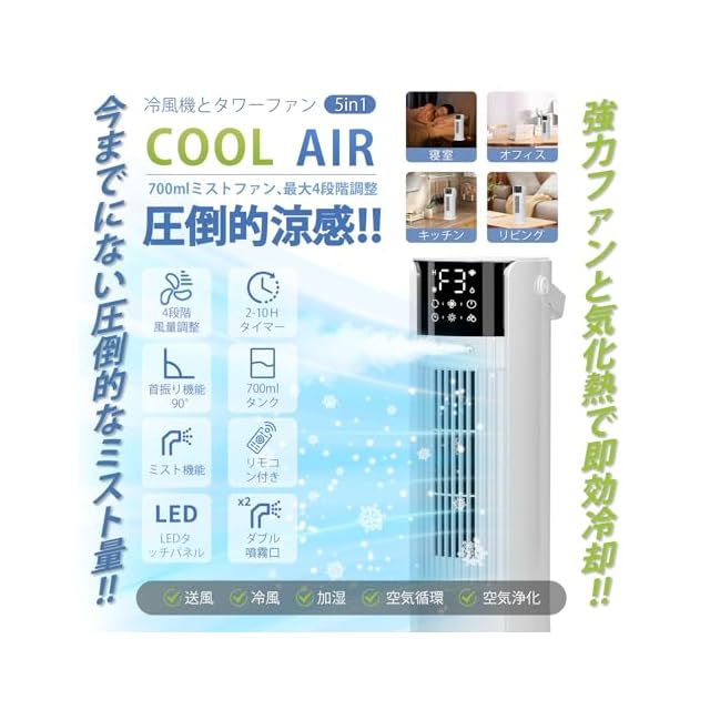 商品名:冷風扇 冷風機 強力【1台多役・送風・加湿・冷却・空気清浄】タワーファン 小型クーラー 最大風速6m/s ダブル噴霧口 4段階風量調整 氷入れ可 700ml水タンク 自動首振り オフタイマー 18W超省エネ 節電対策 細かいミスト レザー持ち手 コンパクト 上部給水 静音設計 リモコン6M制御 ミニ冷風扇 卓上冷風機 オフィス リビング 台所 熱中症対策 暑さ対策 乾燥対策 保冷剤なし
