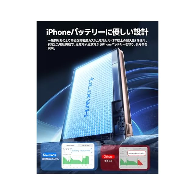 【iPhoneバッテリーに優しい設計】一般的なものより高価な高密度カスタム電池セル(3年以上の耐久性)、三元系材料(NCM:ニッケル·コバルト·マンガン)を採用します。安定した電圧供給で、過充電や過放電からiPhoneバッテリーを守り、長寿命を実現します。iPhoneバッテリーに優しい設計です。