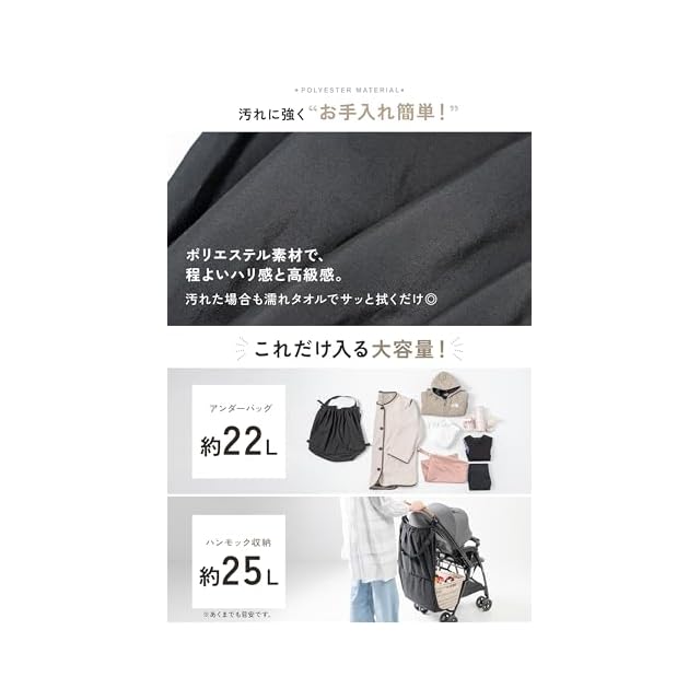 素材: ポリエステル(防汚・撥水加工) / サイズ: アンダーバッグ約22L・ハンモック収納約25L / 耐荷重: アンダーバッグのみ2kg・ハンモック収納時3kg / 対応ベビーカー: フレーム幅45cm以内・ベビーカーと車輪の間に10cm以上のスペース必要 / カラー: ブラック(シンプル&シックなデザインでどんなベビーカーにもマッチ)