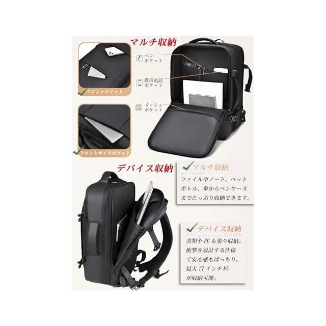 【多ポケット・多収納設計 整理整頓しやすい】【トランク収納】広々としたメイン室には乾湿分類ポケットが付いており、乾いたアイテムと湿ったアイテムを分けて収納できるため、清潔に保つことができます。衣類や大型アイテムを十分に収納できます。【マルチ収納】使用頻度が高いものを入れるスペースとして設計されています。A4サイズの書類やファイル、ノート、ペットボトル、傘からペンケースまでたっぷりと収納できます。フロントコンパートメントには3つのジッパーポケットがあり、小物を整理して収納できます。【デバイス収納】17インチのノートパソコンを安全に収納できる専用ポケットがあります。複数のポケットが設けられており、使い勝手が非常に良いです。