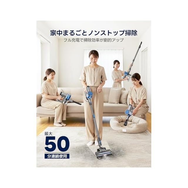 【50KPa超強吸引力&3段階モード&完全自立式設計】業界トップの50KPa超強吸引力が、カーペットに埋もれたペットの毛やソファの隙間の細かいゴミまでしっかり吸引。3段階の吸引力調整(強/標準/エコ)で、フローリングから厚手の絨毯まで、あらゆる床材に最適なパワーで対応可能。さらに独自開発の自立式設計!従来品の「方向転換でヘッド浮き上がり」を完全解消。手を離しても自立するから、掃除中に足で押さえる必要がなく、ストレスフリーで楽々操作。壁掛けスタンド不要のコンパクト設計で、収納時もスペースを取らず、狭い日本家屋に最適!軽量ボディ(2.4kg)に自走式ローラーブラシを搭載。女性でも片手でラクラク操作でき、毎日のお掃除が劇的に軽量化!プロ級の吸引力を実現した、まさに「楽々掃除」の決定版!