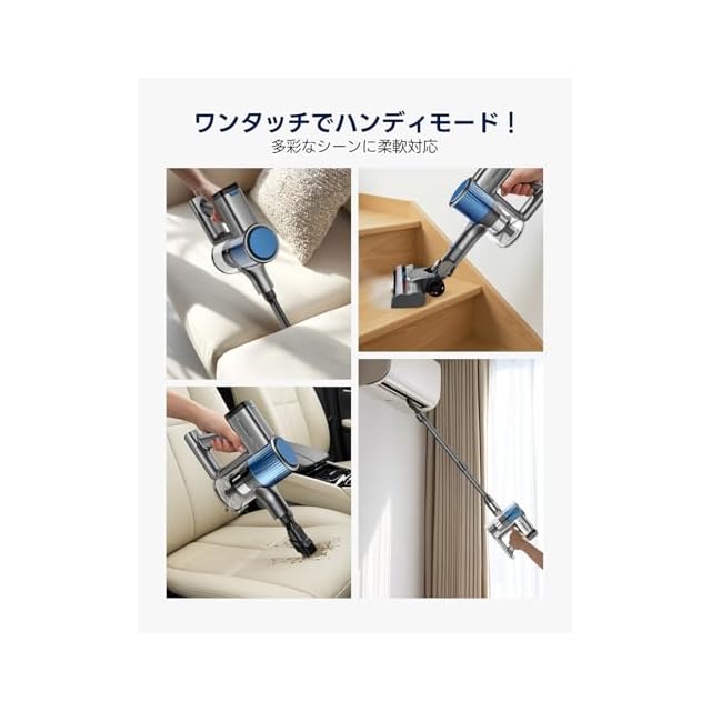 【2WAY仕様&多様なノズル付き&伸縮式パイプ】身長に合わせて細かく調整可能な伸縮パイプを搭載し、スティック型とハンディ型の 2 モードを簡単に切り替えられる設計で、子供から大人まで手軽に操作できます。日本の省スペース住宅向けに最適化されたコンパクトボディは、キャビネットの間やベッドの下など狭いスペースでも円滑に進み、階段を使わずに棚の上や高い窓の周りまで伸縮パイプで届けます。2種類のノズルが付属しており、ご自由に組み合わせて使えます。床の掃除だけでなく、ツールを付け替えるだけで、手の届きにくい場所、布団やソファなどもパワフルに掃除できます。高い場所や車内、細かい隙間などでもしっかり掃除でき、心地よい掃除が実現します。ゴミの吸い取りから拭き掃除まで、一台で何役もこなすコスパ良好のスティック掃除機です。