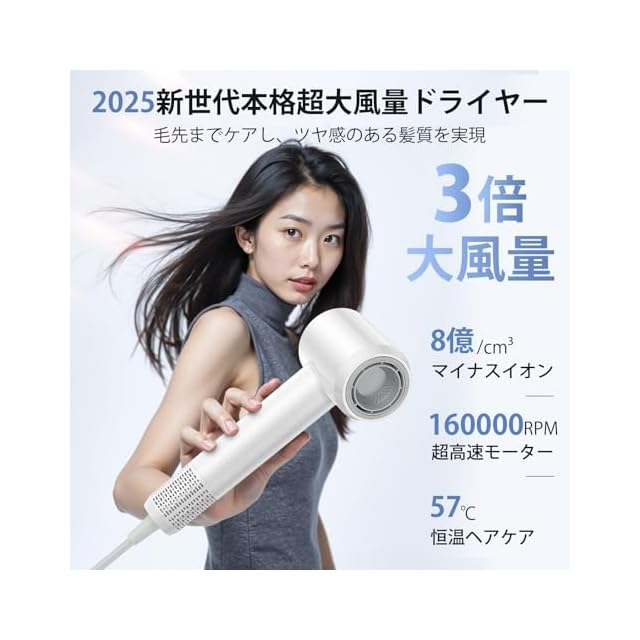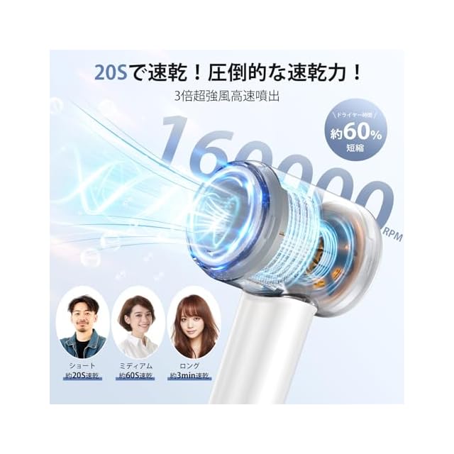 【史上最速!20sで速乾!65%時間短縮を実現!】「速乾・美髪・光沢・保湿・ヘアケア・髪質改善」などヘアドライヤーに対するすべての期待を同時に叶える美髪速乾ドライヤーが誕生!160,000rpmの超高速ブラシレスモーターを採用し、技術革新による新たな送風方法で65m/s圧倒的な大風速&8m³/分の史上最大風量を実現!!従来品ドライヤーより約65%のドライ時間を短縮し、ドライ時の熱ダメージを回避できる髪に優しい大風量ドライヤー !さらに、従来の乾かし方を一新し、高温に頼らず大風速で髪の根元から素早く乾かすため、リアル低温風乾を実現!過度な熱から髪を守りましょう!このドライヤーは抜群の速乾性を持ち、忙しい朝でも効率的に!