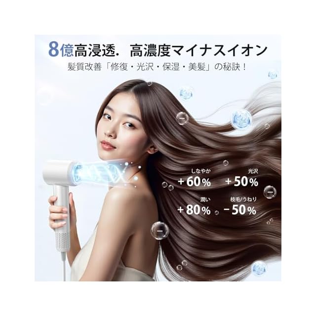 【8億超高浸透マイナスイオン・髪質改善】あなたの髪を一日中サラサラで美しく保つ秘密が、このヘアドライヤーには内蔵されています!①特許取得済みの【8億個の超高浸透・高濃度マイナスイオン】発生装置 →水分がキューティクルのわずかな間へ浸透。さらに静電気を抑制し、髪の乾燥と切れ毛を防ぎます。髪のツヤとまとまりを実感できます!②【AIマート温度制御・恒温ヘアケア】→安定な送風温度を制御し、頭皮と髪にダブルケア、髪の光沢を保つ③過熱防止システム→過熱を防ぎ、髪への熱ダメージを防ぐ!④温冷リズムモード→髪表面が熱くなりすぎる前に冷ますことができ、髪のうねりや広がりを抑えてまとまりのある髪と、ツヤ感がさらにアップ!あなたの髪は、常に潤いと輝きにあふれ、まるでプロの美容師が手入れしたような仕上がりになります。速乾x美髪を両立したヘアドライヤーです。