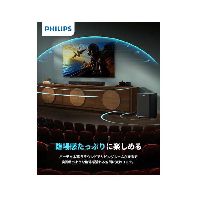 【映画館のような没入型サウンド】:PHILIPS サウンドバーは2つのユニットを内蔵で、バイネルスピーカーはステレオ効果を生み出し、空間に音楽のサラウンド分布を感じることができます。音楽をよりダイナミックに、思いのままに楽しむことができます。DTS Virtual:Xは広い3Dサラウンドサウンドを創造し、前面、左側、右側とサラウンドサウンドに高さを加え、より広く、より高く、より没入的なサウンド体験をお楽しみいただけます。雨や落雷、空中を旋回するヘリコプターなど頭上からのサウンドも的確に再現することで、アクション映画の視聴やテレビゲームのプレイに圧倒的な臨場感を与えます。