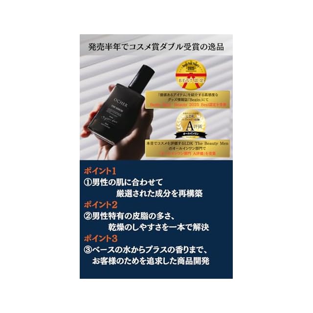 【オールインワンで実現する本格エイジング*ケア】 オールインワン メンズ スキンケア オーカー ザ セラム 忙しい男性のために、化粧水・乳液・美容液の3役を1本に凝縮した、メンズ用オールインワン化粧水・美容液。 乾燥・皮脂・毛穴・くすみ1など、30代男性の肌悩みに多角的にアプローチ。 本気で肌を整えたい男性のための「攻めと守り」のエイジングケア*を実現します。 【厳選された贅沢なエイジングケア*成分配合】 バクチオール(保湿):次世代レチノールとして注目の植物由来成分。やさしく肌にハリを与えます。 ナイアシンアミド(整肌):毛穴やキメを整え、なめらかで清潔感のある印象へ。 CICA(ツボクサエキス):肌荒れやヒリつきが気になる男性に。 ビタミンC誘導体(保湿):明るく健やかな肌をサポート。 アゼライン酸誘導体(整肌):男性特有のテカリやくすみにもアプローチ。 サリチル酸(整肌):肌を柔らかく健やかに保ちます。 【圧倒的な保湿と印象の良い肌の実現】 独自原料のナノプロテインカプセルが、美容成分を角層のすみずみに届け、セミマット処方が皮脂にアプローチし、乾燥しやすい肌にもベタつきがちな肌にも、「うるおい×セミマット」の理想的な質感を実現します。 【香りでスキンケアを習慣化】 西洋ナシとウッディの上質な香り。 朝の目覚めや夜のリラックスタイムを心地よく演出します。 【こんな男性におすすめ】 30代~40代で、スキンケアは始めたいけど手間はかけたくない 20代からアーリーエイジングケアをしておきたい。 テカリ・乾燥・毛穴・肌荒れなど、なんとなく肌に自信がない ビジネスやプライベートで清潔感を大切にしたい *1 年齢に応じたケアのこと