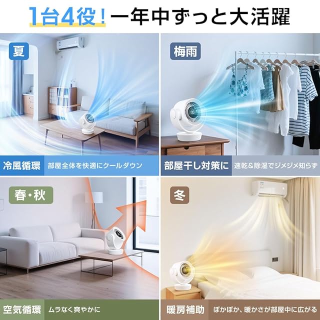 【3D立体ランダム送風・空気循環を効率化】最新型 DCモーター サーキュレーター は、上下左右自動首振り機能と3Dランダム 静音 的に 送風を搭載し、 上下左右に立体的に風を送ることで、お部屋全体の空気をムラなく循環。冷暖房の効率を飛躍的に高め、夏は涼しく、冬は暖かく保ちます。 サーキュレーター として一年中活躍し、部屋干しや除湿にも最適な 小型扇風機 です。