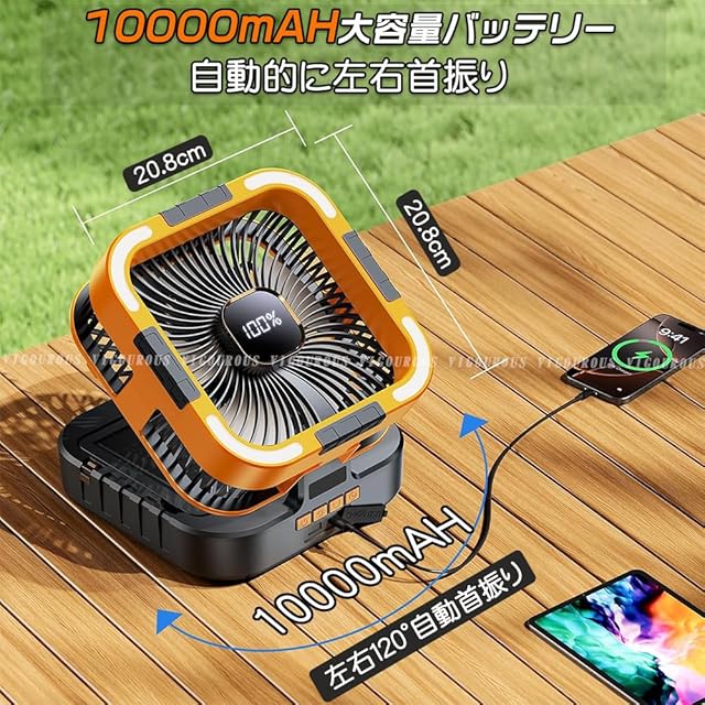 商品名:【2025年新登場!ソーラー充電/自動首振り】ソーラー扇風機 10000mAh USB充電 キャンプ扇風機 左右120°自動首振り ライト付携帯扇風機 6段階風 3段階LEDライト 4段階定時 テントファンア ハンドル付き アウトドア ランタン照明 卓上 キャンプ用 折りたたみ式 家用 屋外 オレンジ
