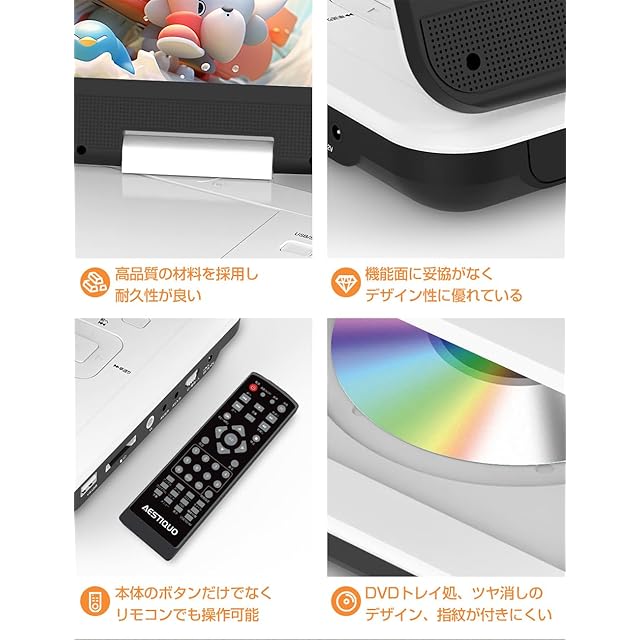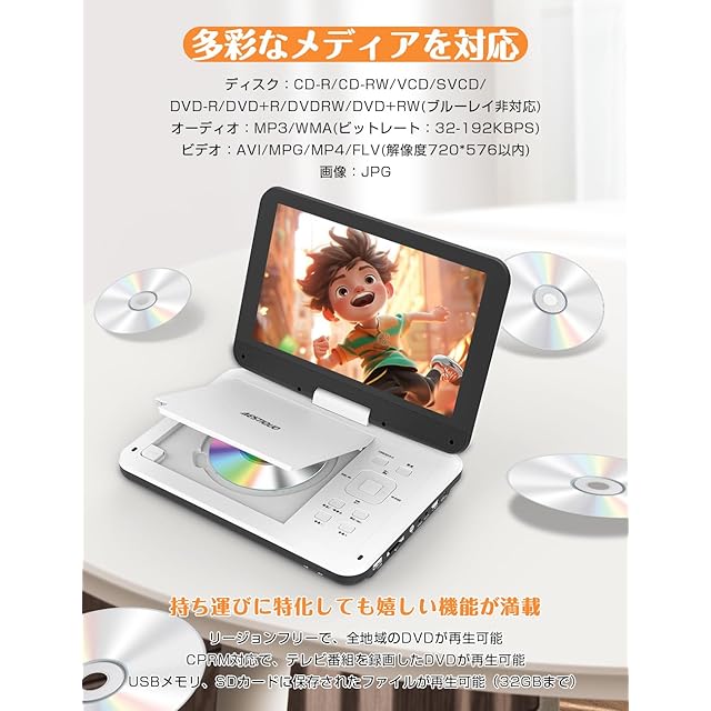 商品名:【2025年 目の保護モード】 ポータブルDVDプレーヤー 12.5型 dvdプレーヤー 10.5インチ液晶 cdプレーヤー【リモコン&リモコン用電池付 】 5時間連続再生 リージョンフリー CPRM対応 レジューム機能 270度回転 TV同期可能 SDカード/USBに対応 軽量 操作簡単 ブルーレイ非対応(ホワイト)